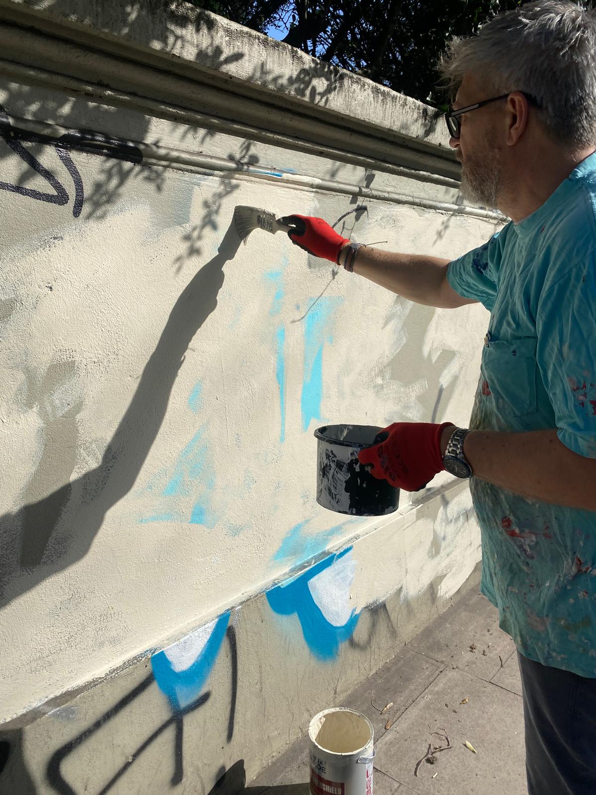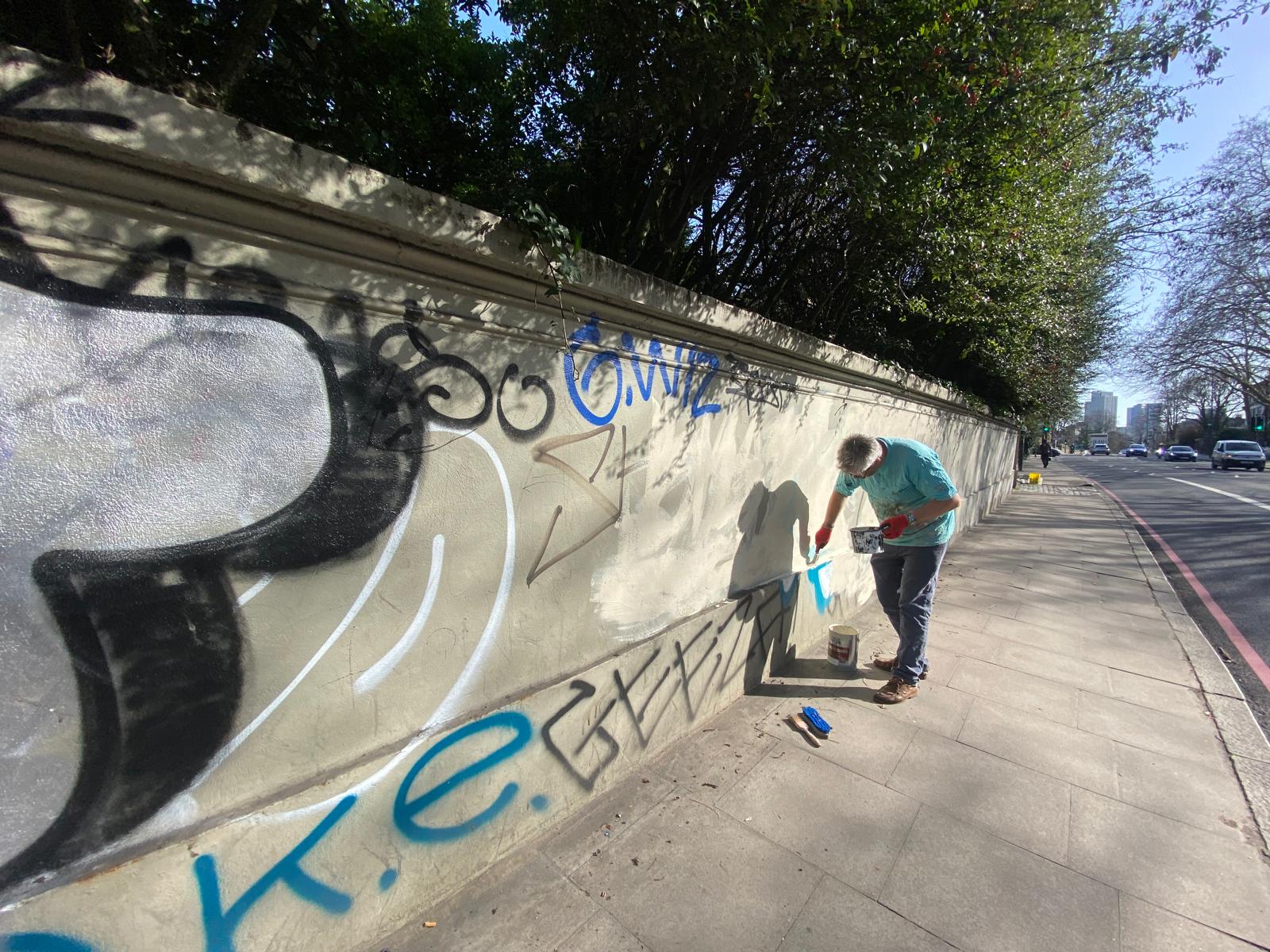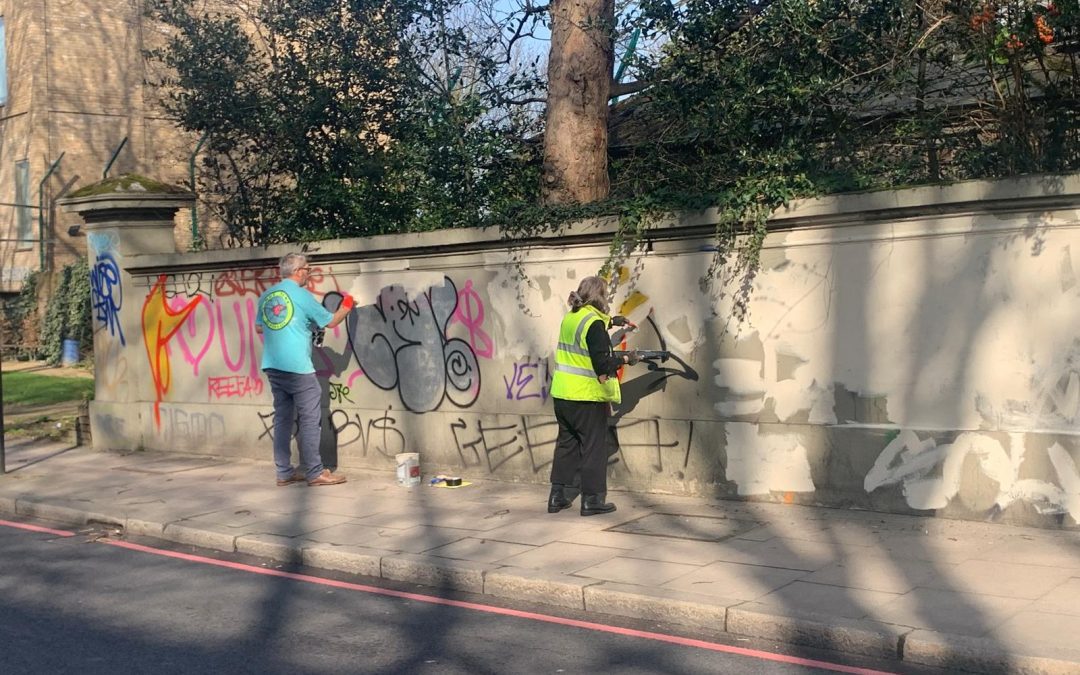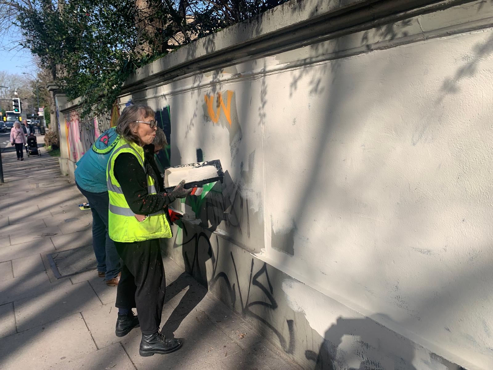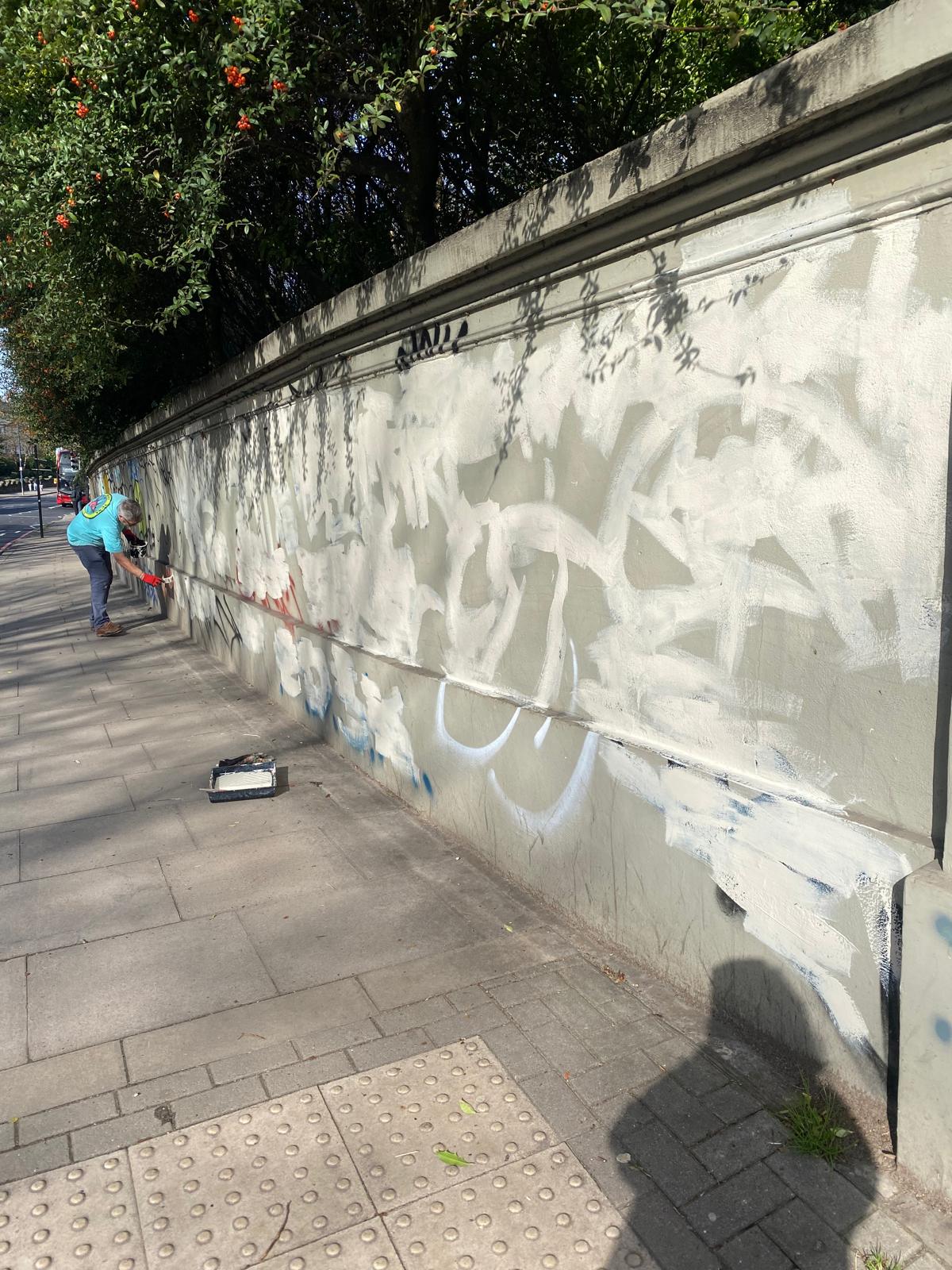 Anyway, as nobody had done anything about it for so long, the local St Johns Society decided to take direct action. On Wednesday a few of us made a start by overpainting the graffiti. We’ll see what happens next. It’s early days, but one thing we have learned from painting murals (we did the bridge across St Johns Station) is that high quality artwork can deter almost all tagging for a very long time. Watch this space. We will keep working on it and let you know where we get to.